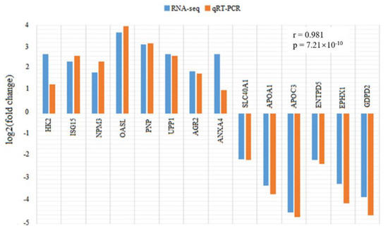 To validate the differential expression analysis of RNA-seq data, 14 genes including HK2, ISG15, NPM3, OASL, PNP, UPP1, AGR2, ANKA4, SLC40A1, APOA1, APOC3, ENTPD5, EPHX1, and GDPD2 were selected to detect their expression differences between the infected and control groups using qRT-PCR (Figure 3). The expression patterns of the tested genes showed high concordance with the differential analysis results of RNA-seq, with a correlation coefficient of 0.981 (p = 7.21 × 10−10), indicating the high accuracy and reliability of the RNA-seq analysis.