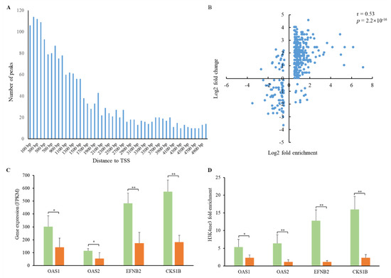 H3K4me3 peak distribution and associations with gene expression. (A) Distribution of H3K4me3 peaks with the distance to the transcription start site (TTS). (B) Associations between H3K4me3 enrichment and gene expression. Pearson’s coefficient r = 0.53, p = 2.2 × 10−16. (C) Expression of the OAS1, OAS2, EFNB2, and CKS1B genes in PEDV-infected and control samples. (D) H3K4me3 fold enrichment of the OAS1, OAS2, EFNB2, and CKS1B genes in PEDV-infected and control samples. Green and oranges bars represent PEDV-infected and control samples, respectively. * p < 0.05, ** p < 0.01.