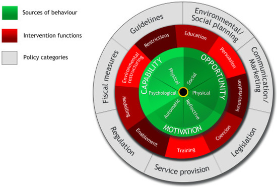 - Michie, S.; van Stralen, M.M.; West, R. The behavior change wheel: A new method for characterizing and designing behavior change interventions. Implement. Sci. 2011, 6, 42. [Google Scholar] [CrossRef] [PubMed]