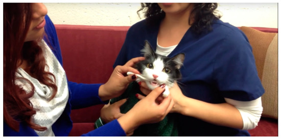 Saliva from cats suspected of having food sensitivities or intolerances was submitted by veterinary clinics and their pet owner clients throughout North America; some samples came from overseas. The collection procedure used a thin cotton rope as described previously [2]. A total of 4214 feline samples have been received and analyzed by our laboratory since early 2013. For purposes of the present study analysis, 1000 cases were selected sequentially without preference covering the period of 21 July 2015 through 15 September 2018. The saliva collection method is shown in Figure 1.