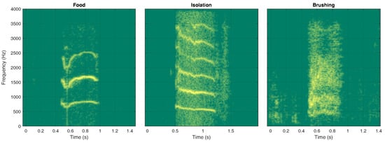 First, the experiment required us to obtain vocalization recordings while minimizing potential influences caused by environmental sounds/noises. Moreover, the characteristics of the room (e.g., topological properties, reverberations, presence of furniture, etc.) should not affect the captured audio signals. Data acquisition could not be conducted in a controlled anechoic environment, since an unfamiliar space might have influenced the behavior of the cat in the waiting for food and brushing contexts. Finally, the relative position of microphones with respect to the sound source had to be fixed in terms of distance and angle, as many characteristics to measure in vocalizations depend on such parameters (see Section 3.1). Figure 1 shows representative spectrograms of samples coming from the three considered classes.