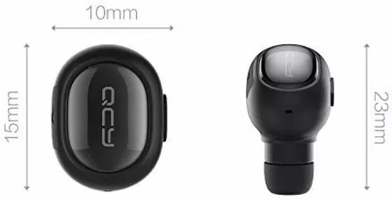 Details of the QCY Q26 Pro Mini Wireless Bluetooth Music Headset. The small hole in the middle of the right view is the microphone.