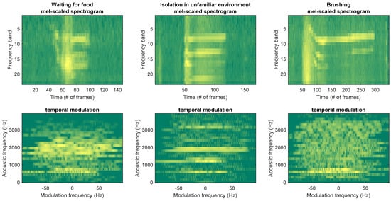Representative representations of Mel-scaled spectrogram and temporal modulation corresponding to all three classes (waiting for food, isolation in unfamiliar environment, and brushing).