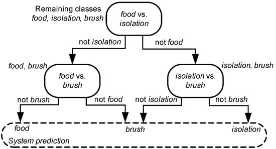 The audio pattern recognition module of the proposed framework operates after the detection of cat vocalizations. It adopts the concept of Directed Acyclic Graph (DAG), i.e., a finite directed graph with no directed cycles [,]. In this way, the classification scheme can be represented as the graph , where denotes the nodes, and the links associating the nodes. A binary classification task was performed by each node n in N through a set of hidden Markov models (HMM), thus originating the DAG-HMM naming.