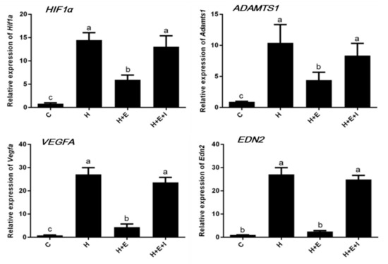 In a separate experiment, the effects of hypoxia on the transcription levels of HIF1A and its downstream genes ADAMTS1, VEGFA, and EDN2, were quantified in cultured bovine ovarian follicles (Figure 2). As shown in Figure 2, these four genes have a similar expression profile. Expression of HIF1A, ADAMTS1, VEGFA, and EDN2 genes are significantly upregulated in the hypoxia and hypoxia + E2 + ICI groups when compared to the control group (p < 0.05). Transcription levels of HIF1A, ADAMTS1, and VEGFA genes are significantly higher in the hypoxia + E2 group compared to the control group, but lower than those in the hypoxia and hypoxia + E2 + ICI groups (p < 0.05).