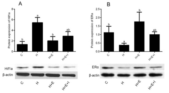 Effects of Hypoxia on the expressions of HIF1A (A) and ERα (B) proteins in bovine early preantral follicles. C, Control; H, Hypoxia; H + E, Hypoxia with E2; H + E + I, Hypoxia with E2 and ICI. Different letters (a,b) on the bar means significant differences (p < 0.05).