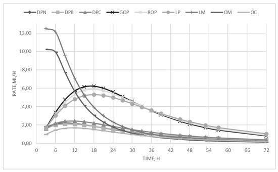 On the other hand, the incubation of dried pomace substrates showed low fermentability and produced a low gas amount. As regards the kinetics parameters, the by-products have been significantly (p < 0.01) differentiated into three categories, i.e., the citrus pulp, that showed the intermediate Rmax, and the highest Tmax, the molasses, that presented the highest fermentation rate that was reached in the lowest time, and the olive oil by-products, which showed the lowest rate of fermentation and needed more than eight hours to reach it. To better highlight the differences between the by-product categories and to understand the curve trends, the fermentation rates are depicted in Figure 1.