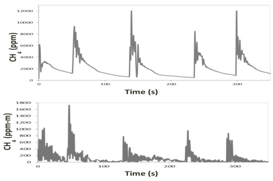 In our study, a mean CH4 concentration of 97 ppm-m with a minimum of 21 ppm-m and a maximum of 303 ppm-m were recorded with the LMD. With the NDIR sensor a mean CH4 concentration of 1268 ppm with a minimum of 58 ppm and a maximum of 3575 ppm was recorded. The values observed with the LMD agree with those observed in other studies; for instance, Chagunda et al. [12,13,14] found average CH4 concentrations between 107–369 ppm-m, depending on the animal activity. The values observed with the NDIR sensor are in line with those observed in other studies [23].