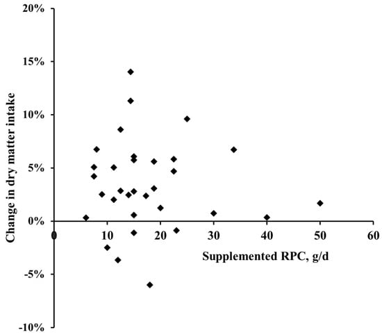 The relationship between the level of dietary supplementation with choline chloride in the form of rumen-protected choline (RPC) ranging from 6 to 50 g per cow per day and the relative change in dry matter intake compared to unsupplemented control cows reported by the studies summarized in Table 1.