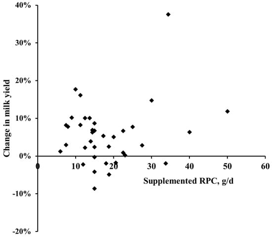 The relationship between the level of dietary supplementation with choline chloride in the form of rumen-protected choline (RPC) ranging from 6 to 50 g per cow per day and the relative change in milk yield compared to unsupplemented control cows reported by the studies summarized in Table 1.