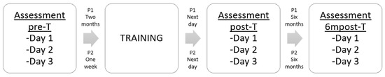 Each primary processing plant was assessed on three occasions; once prior to training (two months prior to training at plant P1 and one week prior to training at plant P2); once immediately post training (assessment commencing the day after training was completed) and once exactly six months after training. Each assessment visit lasted three days and both the welfare assessment and the product quality assessment were repeated on each day (Figure 1). Due to the potential to disrupt production, the stun parameters and neck cut were only assessed on day one of each visit. The assessments were carried out on the same days of the week, and at the same time of day during each visit. Plant management were aware that the assessments were taking place. Although operatives were not specifically told that welfare assessments were being undertaken, they were aware that they were being observed.