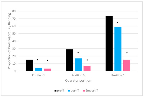 A statistically significant difference in proportion of birds performing vigorous flapping was found in all post-training visits compared to pre-training values. The greatest differences were found at position 6 between pre-T and 6mpost-T in which flapping decreased by 58%.