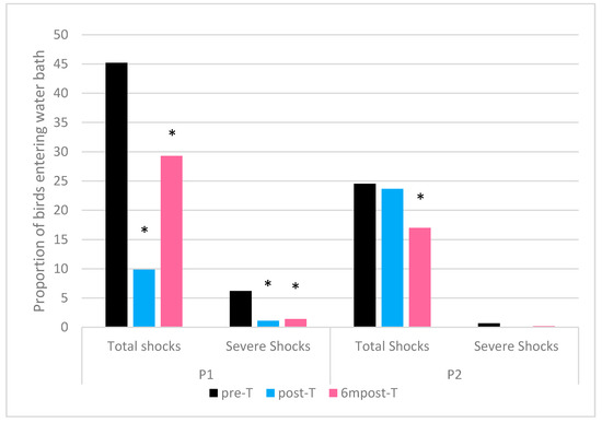 There were less marked differences in processing plant P2 with no significant change between the proportions of birds receiving PSS in pre-T and post-T. There was a significant decrease of 7.5% between pre-T and 6mpost-T and of 6.7% between post-T and 6mpost-T. Severe shocks were less affected, with a decrease of 0.6% between pre-T and post-T and no significant difference between pre-T and 6mpost-T (Figure 4).