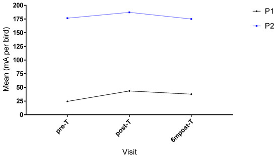 The PSM current recorded in processing plant P1, showed a significant difference between visits, F (2,15) = 58.263 p < 0.0005 (one-way ANOVA). Tukey post hoc analysis was performed, showing that water bath current recorded by the PSM was significantly increased from pre-T to post-T by 19.0 (95% CI 13.1 to 24.91) mA per bird, p < 0.0005 and pre-T to 6mpost-T by 13.167 (95% CI 7.00 to 19.33) mA per bird, p = 0.001. However, the current had decreased significantly between post-T and 6mpost-T by 5.83 (95% CI 1.86 to 9.81) mA per bird, p = 0.011.