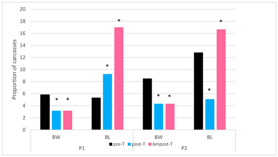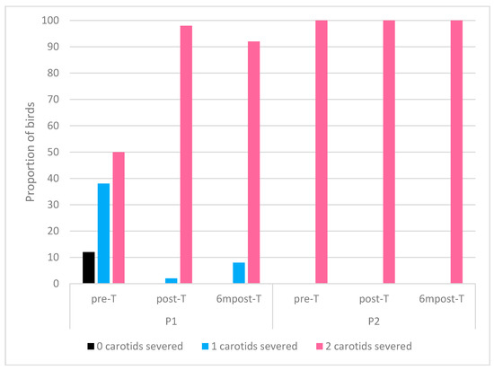 In processing plant P1, the proportion of birds with both carotids severed increased from pre-T to post-T and 6mpost-T. The proportion of birds with both carotids intact decreased to zero in post-T and 6mpost-T, while those with one severed carotid also decreased after pre-T (Figure 6).