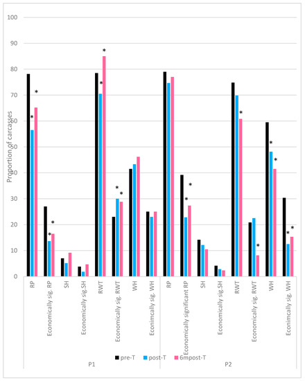 Proportion of carcasses with product quality defects (RP—red pygostyles; SH—shoulder haemorrhage; RWT—red wing tips; WH—wing haemorrhage) and economically significant quality defects (RP—quality assessment score 2; SH, RWT, WH—quality assessment score 2 and 3). * represents a statistically significant difference in proportion from pre-training visit (p ≤ 0.05) calculated using the exact Chi-squared test.