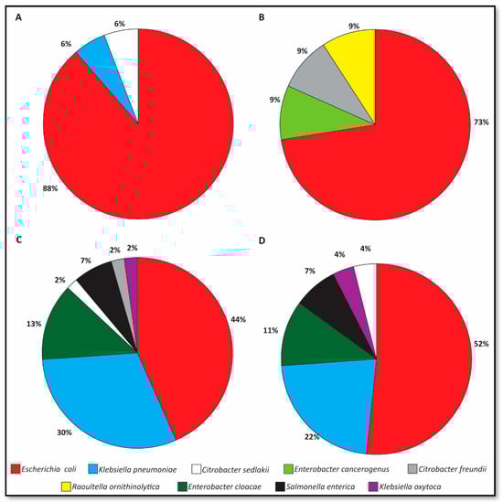 Species distribution of ESBL-E shedding on admission; foals (A, n = 18 isolates) and mares (B, n = 12 isolates); and 72 h post admission, foals (C, n = 46 isolates) and mares (D, n = 27 isolates).