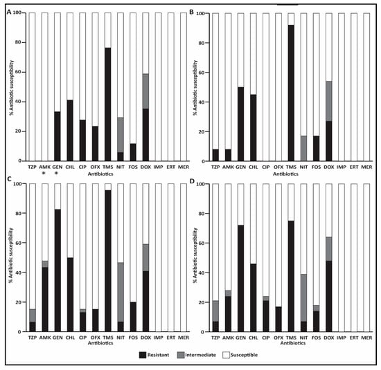 Antibiotic susceptibility profiles of ESBL-E shed on admission; foals (A, n = 18 isolates) and mares (B, n = 11 isolates); and 72 h post admission, foals (C, n = 46 isolates) and mares (D, n = 29 isolates). Significant changes are marked with asterisks.