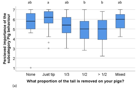 Scoring of the importance of Adding bedding material as an intervention measure when tail biting occurs in a pen on (a) farms which rear pigs with different proportions of the tails removed (n = 176) and (b) using different bedding amounts (n = 180). Scale: 1 (not important) to 7 (extremely important). The boxplot indicates medians and quartiles (25 and 50%) as well as outliers. Boxes lacking common letters differ (p < 0.05).
