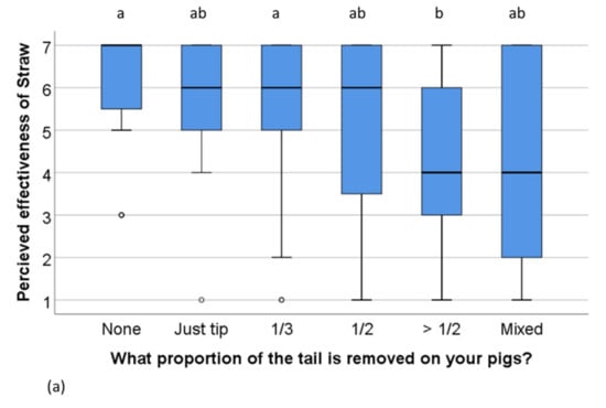 Scoring of the effectiveness of Straw as a manipulable material to prevent tail biting on (a) farms which rear pigs with different proportions of the tails removed (n = 155) and (b) farms using different bedding amounts (n = 162). Scale: 1 (not effective) to 7 (extremely effective). The boxplot indicates medians and quartiles (25% and 50%) as well as outliers. Boxes lacking common letters differ (p < 0.05).