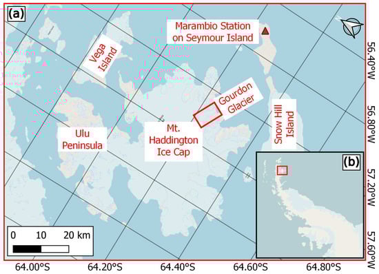 (a) Map of JRI with the Ulu Peninsula on the left, Mt. Haddington at the central part, and Gourdon Glacier on the eastern side, as well as the adjacent islands. (b) Overview map with the marked location (red rectangle) of JRI at the northern Antarctic Peninsula. © OpenStreetMap contributors