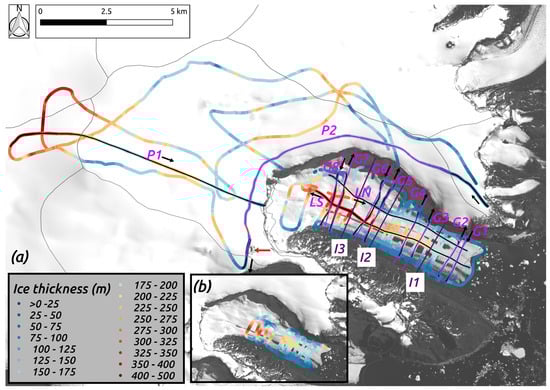 (a,b) Ice thickness measurements from the GPR campaigns 2018 (a) and 2017 (b). Profile lines (G1–G8, LN/LS, P1/P2) used for the radargrams are shown in black with arrows indicating the flight direction. In the foreground of the GPR profiles are the flux gates G1–G8 and P2 with a maximum overlap with the in situ GPR data (bright purple lines) and at glacier areas with purely interpolated data (I1–I3, dark purple lines). The red arrow indicates a bedrock outcrop within the ice cap. Background image: Landsat-8 (20 February 2017, courtesy of the U.S. Geological Survey).