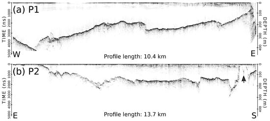 - Blindow, N.; Salat, C.; Casassa, G. Airborne GPR sounding of deep temperate glaciers—Examples from the Northern Patagonian Icefield. In Proceedings of the 2012 14th International Conference on Ground Penetrating Radar (GPR), Shanghai, China, 4–8 June 2012; pp. 664–669. [Google Scholar] [CrossRef]