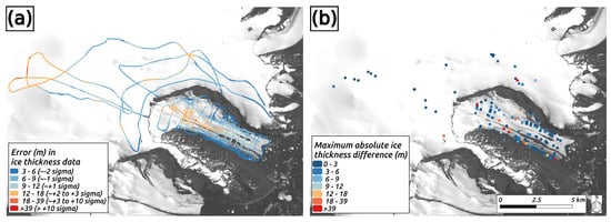 (a) Summed data error in ice thickness data for 2018. The values in the brackets within the legend describe the deviation from the mean error of ∼9 in terms of the standard deviation of ∼3. (b) Maximum absolute ice thickness difference at crossing flight paths for 2018. Background image: Landsat-8 (20 February 2017, courtesy of the U.S. Geological Survey).