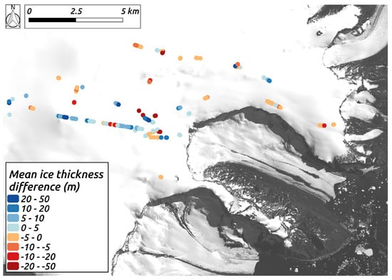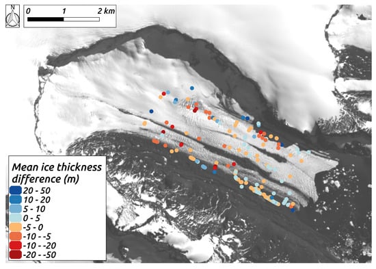 Mean ice thickness difference between 2018 and 1995–1998 within a search radius of . Background image: Landsat-8 (20 February 2017, courtesy of the U.S. Geological Survey).