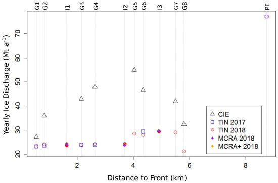 Ice discharge () in the year 2017 for the different ice thickness sources from in situ (unfilled symbols) and interpolated (filled symbols) data along the flux gates shown in Figure 2a.