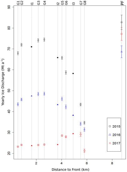 Due to the reason that the ice thickness of the GPR measurements from 2017 is similar to the values for 2018, we resign a specific error calculation for the radar measurements from 2017. The unknown error in ice thickness for the CIE data is surely much higher, influencing the overall higher ice discharge estimates for all flux gates. The ice discharge estimates for 2017 are mostly in the same range like the values for 2018. The higher uncertainty from the upper located flux gates such as for G8 can be a result from the higher amount of no-data values (Table A3) which additionally introduced uncertainty.