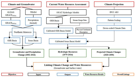 A three-fold approach was used to offset the lack of field data, yet still examine the interactions and trends in climate change and total water resources in a typical managed, arid environment. First, regional and watershed-scale variations in precipitation, total water storage change, and groundwater level changes were quantified using TMPA 3B43v7, GRACE RL05, and Global Land Data Assimilation System (GLDAS) datasets. Second, remote-sensing-based rainfall-runoff models were constructed to assess the current water resources budget. Third, projected climate change impacts were estimated from a 40-General Circulation Model (GCM) ensemble using IPCC AR5 data and combined with hydrologic models to estimate the potential climate change impact. Figure 2 shows the objectives, data inputs/outputs, and how the results link together to better understand water resources in Morocco as well as the connection between groundwater and climate change.