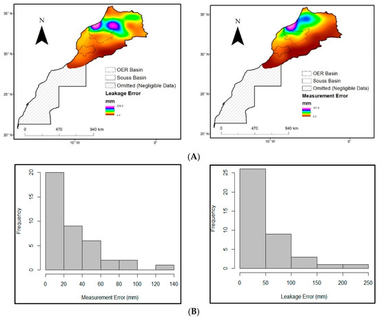(A) Measurement and leakage errors for GRACE; (B) Histogram error distribution for measurement and leakage errors within Morocco.