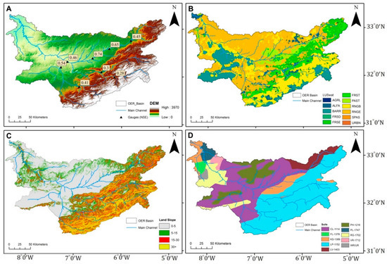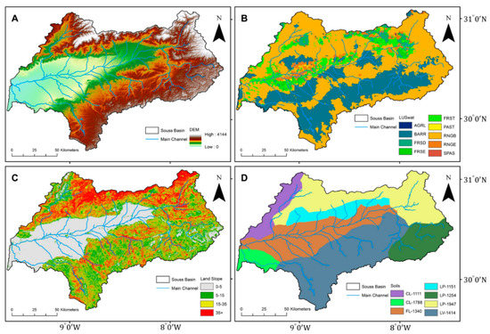 Souss Model input: (A) Digital Elevation Model; (B) landuse; (C) percent slope; and (D) soils.