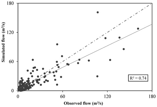 Simulated vs. observed flow in the Oum Er Rbia River at the Mechra Eddahk station.