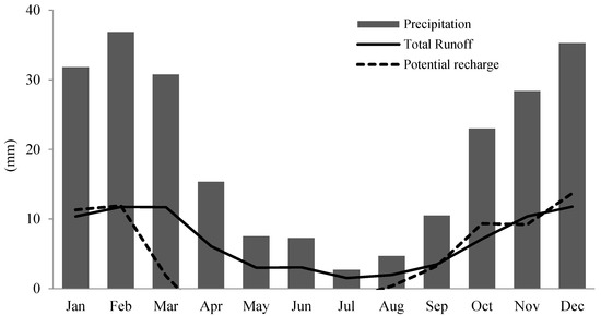 Monthly average (1979–2014) runoff at the outlet (solid line), potential recharge (dashed line), and precipitation (bars) in Souss Basin.