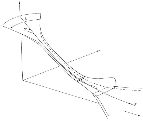 In deriving the system of Equations (1) and (2), we have assumed that the snow masses move in a channel with rectangular local cross-section that varies with the longitudinal coordinate along the channel axis. The structure of (1) also applies if the geometry of the channel cross-section varies but is prescribed as a function of the longitudinal coordinate. Here, t, S are the time and space coordinate along the avalanche trajectory on the bed (see Figure 1); , are the unknown values of the S-component of snow velocity averaged over the full cross-section of the flow and the area of this cross-section, respectively; , are the local width of the cross-section and local inclination of the channel axis; g is the gravity acceleration, is the projection of the full acceleration (gravitational plus centrifugal) of the snow “particle” onto the direction normal to the bed. Recall that u is averaged over the cross-section and along the S-coordinate with averaging scale larger than the depth of the flow. k is the hydraulic resistance coefficient; is the so-called hydraulic radius, and r is the curvature radius of the channel axis. The values of , , q are specified as follows. We follow Grigorian [4] and Grigorian and Ostroumov [5] for the friction force on the bed surface and adopt the expression ([1], Note 2)
