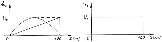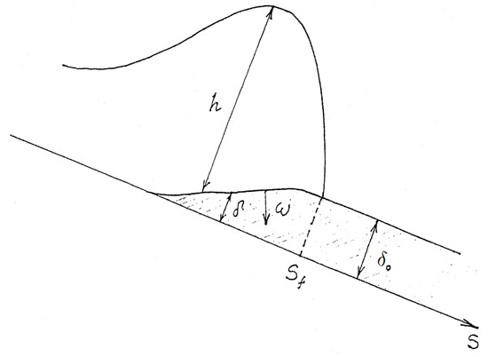 and it is obvious that, to derive Equation (45) from the corresponding momentum Equation (1) of the full model, we must neglect the term representing the gradient of normal force acting at the cross-section of the avalanche body ([1], Note 12), , and include the hydrodynamic resistance term, , in the expression for , if desired. Up to this point, there is no difference between the simplified model of Section 3 and that under consideration here. Such a difference appears when we look at the next simplification in this simplest point-mass model, which assumes the flow depth H to be constant. As calculations with the full or simplified model reveal, H varies significantly in the course of the avalanche propagation along the mountain slope. One may, nevertheless, hope that it is admissible for rough estimations to use .