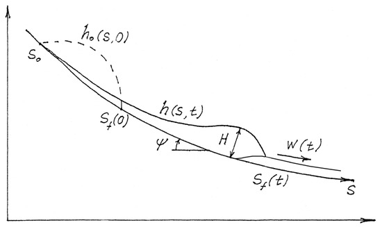 Here, again, t and S are the time and the space coordinate along the avalanche path (see Figure 3), is the coordinate of the avalanche front, etc.; is the local depth of the avalanche; , are the initial distributions of and , respectively; f is the retarding acceleration given by the relation