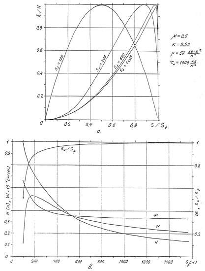 The calculations with the full model were performed in a simple geometry with . On the interval , different initial distributions , were prescribed, and different combinations of the values of the parameters , k, , , and were tested. Table 1 details the parameter values for the different variants. The basic variant was , , , , kPa ([1], Note 8). was prescribed as triangular or parabolic forms with different values of ; for , a uniform distribution was used (see Figure 4). Figure 5a presents the distribution of as a function of S in different stages of the motion. Figure 5b plots the evolution of , H, w, and against , where is the S-coordinate of the point where . All these data relate to the basic variant. Figures S2.1–S2.9 in SMD 2 illustrate analogous results for other variants.