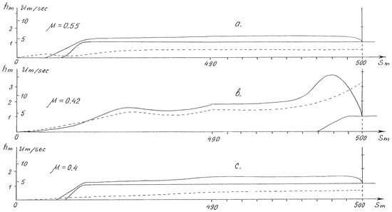 The results of calculations with the full model (Section 2), the simplified model of Section 3 (formulas (23) and (24)), and the improved simplified model described in Section 5 (formulas (36), (39) and (40)) are presented in terms of the flow depth H and the front velocity w as functions of the front position . For the simplified models, the value of the shape factor was always chosen as ([1], Note 9).