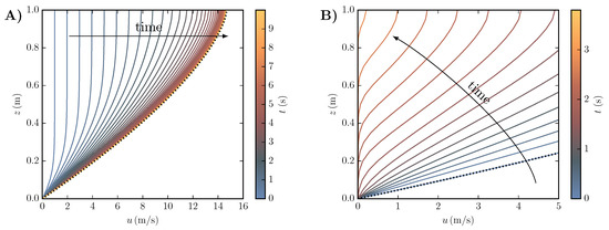 Velocity profile of an infinitely long avalanche with colour marking the time. (A) Acceleration on an inclined plane. The simulation started from rest, the velocity profile tends to the Bagnold profile in steady state (black dotted line). (B) Deceleration on a flat plane. The simulation started with the steady state Bagnold profile of an inclined plane from panel A, and leads to a gradual deposition starting from the bottom.