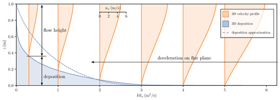 Deposition is a consequence of the avalanche decelerating, as parts of, and finally the entire avalanche, reach standstill. Up until now the deposition process has not been incorporated explicitly into snow avalanche simulations. Usually, deposition is assumed when the avalanche reaches a depth-averaged velocity of , which corresponds to an abruptly stopping block. Here, the solution for the transient velocity profile hints towards a different stopping behaviour. Considering the Bagnold profile from steady state at a slope angle of from Figure 1A, a sudden reduction of the slope angle to leads to a deceleration of the avalanche and a variation in the velocity profile as shown in Figure 1B. It can be seen that not all of the avalanche comes to standstill at the same time. Rather, the avalanche comes to standstill layer-wise starting from the bottom so that the moving mass is reduced gradually. The stopped, that is, deposited volume, expressed by the height where , is shown as a function of the depth-integrated momentum in Figure 2 together with the velocity profiles of the moving layer. This behaviour has to be modelled within the depth-integrated framework by expressing the flux from the moving to the static layer, that is, the vertical velocity of the highest point where .