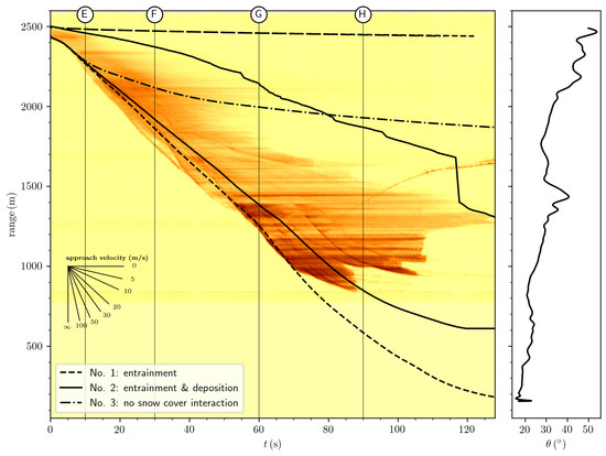 Moving target identification plot of avalanche #0019. The GEODAR data are shown in the background. Black lines give the front and tail position extracted from the simulations. No optimization of parameters has been conducted for this avalanche, but material and model parameters are taken from optimization to avalanche #0017 in Figure 4. Simulation no. 1 solely includes entrainment, simulation no. 2 includes entrainment and deposition, vertical lines correspond to the snapshots (E–H) in Figure 6. Simulation no. 3 is drawn as reference without entrainment and deposition. The slope angle along the line of steepest descend is shown in the right panel. A velocity legend is included for quick translation of front inclination to approach velocity. Black lines represent the front and tail position extracted from simulations (Section 3).