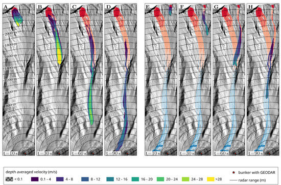Time series of the simulation for avalanche #0017 (A–D) and #0019 (E–H) at 10, 30, 60 and . Concentric circles mark the line-of-sight distance from the bunker giving the radar range. The flowing avalanche is indicated with the depth-averaged velocity . In the background, snow cover changes due to entrainment (red) and deposition (blue) are indicated with the same colour scale as the simulated mass balance in Figure 3.