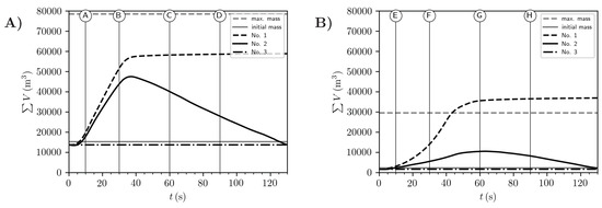 The sum of the mobilized volume in the simulation for (A) avalanche #0017 and (B) avalanche #0019 for the three simulation setups no. 1, no. 2 and no. 3. The vertical markers A–D and E–H correspond to the snapshots of the simulations in Figure 6 and the markers in the MTI images (Figure 4 and Figure 5). Gray horizontal lines give volumes of initial release (lower line) and total volume (upper line), reported by Köhler et al. [29].