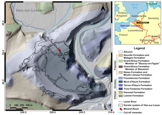 The target of the investigation was a characteristic stalagmite in the Han-sur-Lesse cave called “The Minaret”. The karstic system of Han-sur-Lesse is situated in the SSE of Belgium and one of the longest cave systems in Belgium. It is an underground cut-off meander of the Lesse River in the Givetian limestone (Figure 1). This system is the result of two genetic phases [28,29,30,31]. First, during the second part of the Mesozoic (Cretaceous, tropical climate), the partial dissolution of limestone occurred leading to “ghost rock”, a very porous matrix in place constituted by the retention on-site of residual insoluble phases [29,32,33]. In the second phase, during the Neogene, an uplift of the high plateaus of Belgium led to the incision of epigenetic rivers, which cross the different geological lithologies. Then, the digging of the valleys allowed rivers to meet the “ghost rock” and to excavate them, forming the speleological caves. Today, this system is still evolving (e.g., new dissolution, alluvium deposition, enlargement by collapses, formation, and growth of speleothems). The sedimentary serial in the Vervietois gallery is a good indicator of this past evolution [31].
