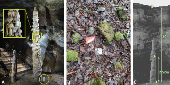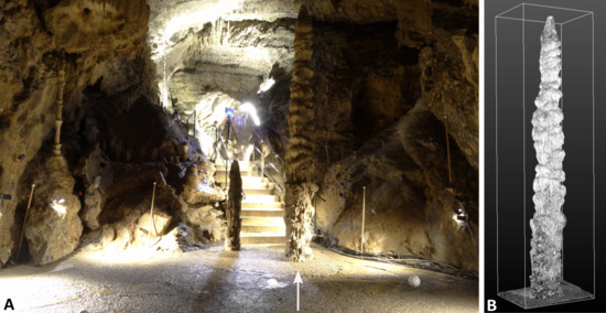 A 3D laser scan of the Minaret stalagmite was realized to capture its shape. The equipment used was a FARO Focus 3D infrared phase scanner capable of covering distances up to 154 m. The registration of individual scans was based on plastic spheres and some extra golf balls (Figure 2). An internal compass and electronic leveling data were used during the registration. A medium resolution was chosen and the color option for the scanning was not used, resulting in about a 10-min time per scan, which was adapted to the length of the time between two visiting groups. The median point error of the registration is estimated to be smaller than 6.4 mm.