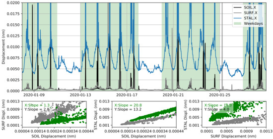 Top: Hourly variations of displacement amplitude (Root Mean Square; RMS) of the ambient seismic noise (11 to 16 Hz, X-component) measured at the surface (SURF, gray) at the base of the stalagmite (SOIL, black) and attached to the stalagmite (STAL, blue), based on [49,50]. Weekdays are indicated by green shading. Bottom: Relation of the displacement amplitudes observed by the three sensors for both horizontal components.