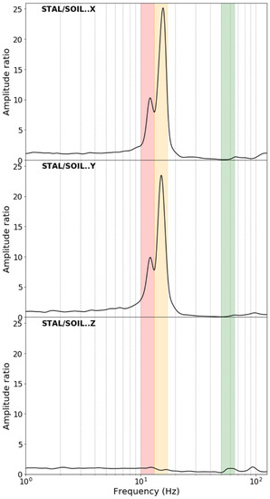 Response of the stalagmite after deconvolution between the stalagmite (STAL) and the signal of the cave ground (SOIL). In red and orange, two split natural frequencies of the first set of peaks, and in green, the position of the second set of peaks of the stalagmite are highlighted.